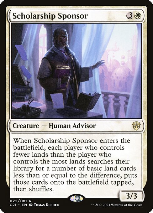 When this creature enters, each player who controls fewer lands than the player who controls the most lands searches their library for a number of basic land cards less than or equal to the difference, puts those cards onto the battlefield tapped, then shuffles.